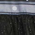 Checkered red, black and white short sleeve peplum top; silver foil Harley Quinn logo on chest; button, belt and spike bracelet design; matching bow; Dazzling glitter-printed mesh top skirt with poly spandex lining; leggings with elastic waist and denim shorts over tights design