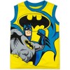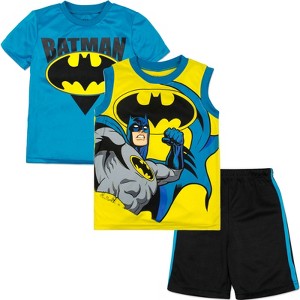 Officially licensed DC Comics Justice League toddler boys 3 piece mix n’ match clothing set: short sleeve graphic tee shirt, sleeveless tank top, and shorts