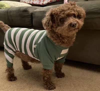 What nice pj’s for your family pet! Bands around neck and legs are stretchy fabric for comfort and no binding! Legs are mid length and do not interfere with walking! Perfect weight for indoors in fall and winter. Elastic at back end and stomach area keep fabric near body and no sagging! Sizing was accurate; 14 lb mini poodle wears a medium.