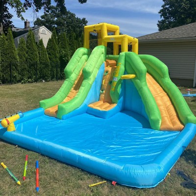 We bought this for our 5 year olds to use during the summer. It is easy to set up and inflates very quickly. We’ve used it during a birthday party with children ages 3 to 10 and everyone had a great time! The one slide is steeper than the other so they slide down very fast! All of the kids preferred the steep slide! The only minor issue we had is that the pool area below doesn’t extend far enough out at the bottom of the steep slide, so the kids crash into the little inflated side wall. Not sure if this will cause wear & tear eventually. So far it has held up! We love this slide and found the price to be very reasonable!