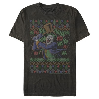 Get ready for the holidays in this officially licensed Men's Black Warner Brothers Batman Joker Sweater Tee! Featuring the Joker laughing maniacally and a Christmas sweater print in the background, you can be festive and popular with all the Batman fans this season! Dress in style in this new graphic tee today!