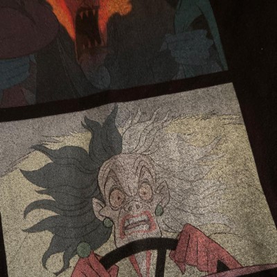 • A: The t-shirt features Cruella da Vil, Evil Queen, Hades, and Maleficent.