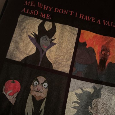 Who wants to be the hero when you can be the villain? Bring out your inner heart breaker this Valentine's Day with these officially licensed Disney Villains styles. This hilarious Mens' Tee features a meme with Cruella da Vil, Hades, Evil Queen, and Maleficent. This tee will surely let them know how you really feel!