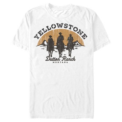 Get ready to head back to the West to watch the Dutton Family endure the dangerous and complicated ordeals of 19th century Montana ranching life in this officially licensed Yellowstone Riders of the Ranch Tee! Featuring the words "Yellowstone Dutton Ranch, Montana" and the silhouettes of three men in cowboy hats riding horses on the Montana landscape.