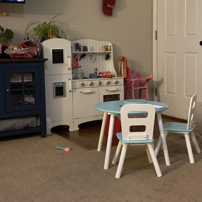 Love the color, not the most sturdy but my kiddo isn’t rough so it will be okay. She is so excited to keep her kitchen toys in the middle pocket. Building was incredibly easy. Just twisting legs on. Only 4 screws for the back of the chairs. The screws they provide have a blunt end but the predrilled holes are not big enough. Even with a drill they wouldn’t go in more than half way, and stripped. Luckily my junk drawer had similar sized spare screws with a point and went in easy peasy.