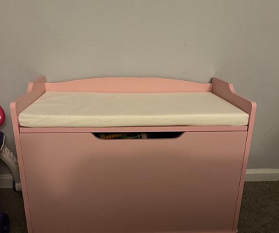 Beautiful bubble gum color. Instructions over all were easy to follow. The top part does not fully shut without the cushion. Very sturdy and spacious storage.