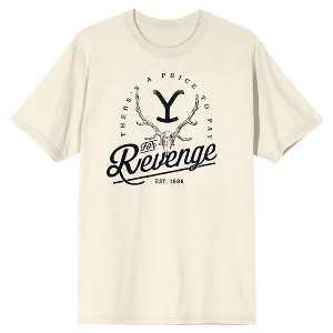 GRAPHIC TEE: The Yellowstone Y logo appears on this graphic tee in between a pair of deer antlers. Black text spells out, "There's a price to pay for revenge." Fans of the series will love this t-shirt.
