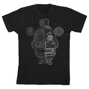 • GRAPHIC DESIGN: This boy's tee features scary animatronic Freddy Fazbear's face split down the middle. One side is grey and shows the flesh out robot. The other side is outlined in white and shows the metal exoskeleton.