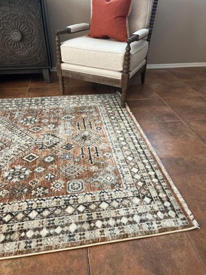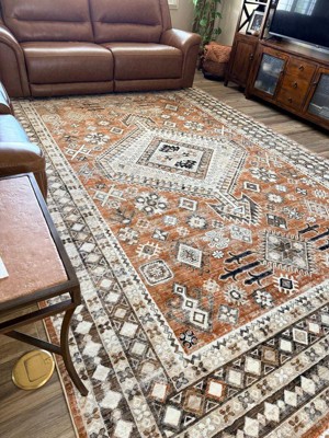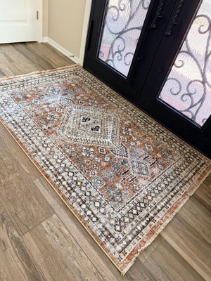 [This review was collected as part of a promotion.] This rug is BROWN. There is absolutely no color in it that comes close to rust. The pattern is also not as visible as represented. Returning.