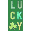 • Featuring a shamrock with the word "Lucky" broken up and stacked, filled in with cool green tie-dye!
