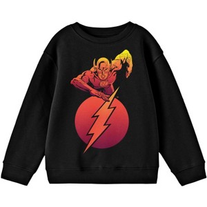 GRAPHIC DESIGN: This youth sweatshirt features the superspeed legend The Flash, striking a running pose in a two-toned color of red and yellow. In front of him is his lightning bolt and circle logo in dark red color.