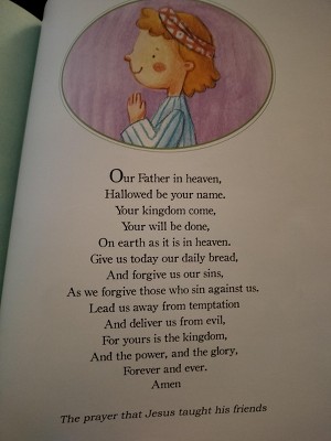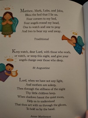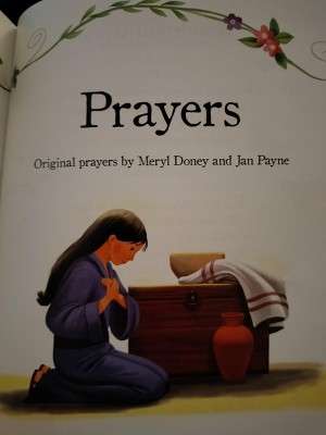 Its a very nice book, shiny gold pages on the side, it has index for the stories, and the prayers are at the end of the book. Pictures are nice, and its a soft-hard cover book. Looking through the prayers, it has the LORD's prayer and they put a name or "orignal" under it, some Amish Gaelic African Asian thrown in there, but there was a prayer where it prays TO Mark, Luke and John and one to Augustine (pic) and that's wrong and against God. We are not to pray to anybody except God the Father, all prayers are listed to the Lord and the Father except those. It also asks "angels to bless" when Angels do not bless but only God (wont let me load the pic). I honestly would remove these pages because it doesn't align with the Holy Bible, but I will teach my kid how its wrong instead. This is why it recieved 2 less stars in the review. Everything else seems good about the book and its very nice.