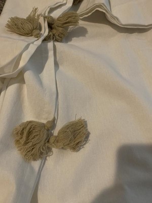 [This review was collected as part of a promotion.] I have this Boho Faux Linen Texture curtain panel hanging in my bedroom. I love the gray tassels on the sides. They give it a little decor without over doing it. I was afraid that because the panel is white that it would let in too much heat from the sun but it's just thick enough to help that problem and still let a little light in. I really like it.