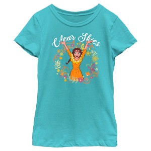 Join the Madrigal family for some magical and musical fun in the mountains of Colombia in Disney's new hit film Encanto! This officially licensed Girls' Pepa Clear Skies Tee features an adorable depiction of Pepa Madrigal framed by pretty flowers and the phrase "Clear Skies." Grab this new tee today and show your love for your new favorite Disney movie!