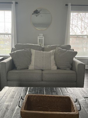 [This review was collected as part of a promotion.] This pillow cover is really well made and the design is a great mix for different styles. Goes perfectly with our gray comforter and linen headboard. The size is good for putting behind your back when sitting on the bed and looks good on a queen size bed.