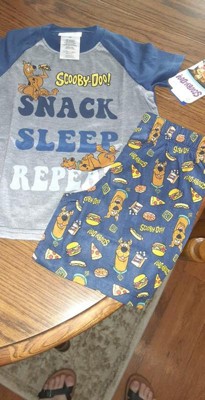CLASSIC CHARACTER DESIGN - This pajama set-top features Scooby with the words "Snack Sleep Repeat" and the Scooby-Doo logo. The bottoms feature Scooby surrounded by different food such as pizza, donuts, hamburgers, hotdogs, and Scooby Snacks.