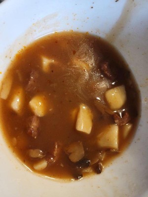 The soup had an odd flavor to the broth. The beef has an odd consistency, cut in neat chunks. All well done , very spongy bites. It was not a good spicy for me.