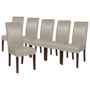 Whether you're moving into a new home or refreshing your current living space, having a place to relax together for a meal with family and friends or a comfortable place to unwind and indulge in some self care after a long day is a must. This set of six beige faux leather upholstered parsons chairs with generous padding is the versatile seating option you need. Featuring a timeless, panel back design and a solid hardwood frame in mahogany, this chair will be a beautiful addition to your home. The minimalist, armless design serves perfectly as a dining chair or accent seating in the bedroom, living room or foyer and maintains an open feel. With a 300 lb. weight capacity, all of your guests can enjoy a worry free seating experience. Assembly takes less than 30 minutes and the chair cleans easily with vacuuming or light brushing. Additional Features: Vacuum or Lightly Brush to Clean, Assembles in 30 Minutes or Less