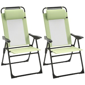 Outsunny Set of 2 Folding Patio Chairs, Camping Chairs with Adjustable Sling Back, Removable Headrest, Armrest for Garden, Backyard, Lawn, Green