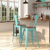 Product Name: Merrick Lane 24" Metal Indoor-Outdoor Counter Stool with Vertical Slat Back, Integrated Footrest and Wood Seat in Mint Green