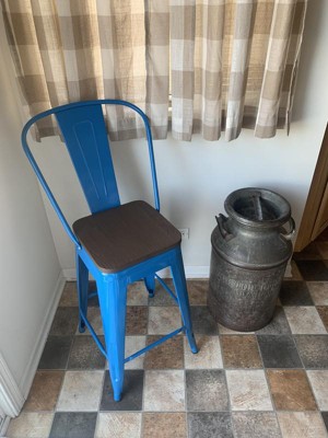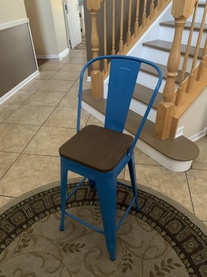 [This review was collected as part of a promotion.] Lily 24” high blue metal counter height stool with back and wood seat is perfect for your dining room, kitchen counter or bar. It is stylish and gives my home a refreshing rustic feel with its metal and wood features. This beautiful stool is designed for both commercial and residential use. It features a curved back with a vertical slat and a cross base for added support and stability. The wood seat adds comfort and beauty and the glides protect my floor by sliding smoothly when moving. It is well designed, well made, sturdy and easy to assemble. Great product, highly recommend.