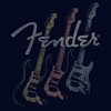 Get ready to hum, strum, and succumb to officially licensed Fender styles! If you've always wanted your very own Stratocaster guitar, now is your chance to get one! Or... at least get one on a rockin' tee! This Juniors' Tee features a distressed graphic of the Fender logo along with three Stratocasters in yellow, pink, and blue.