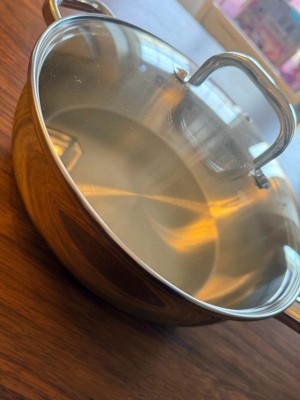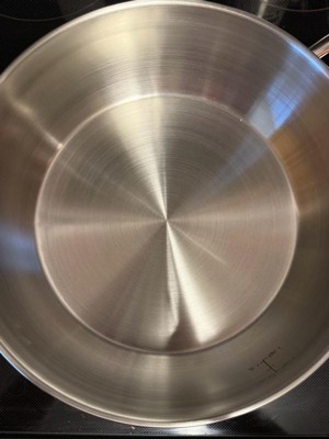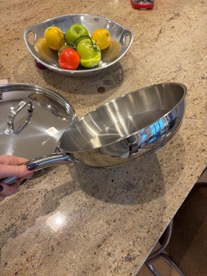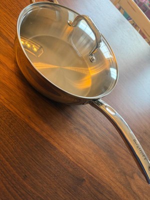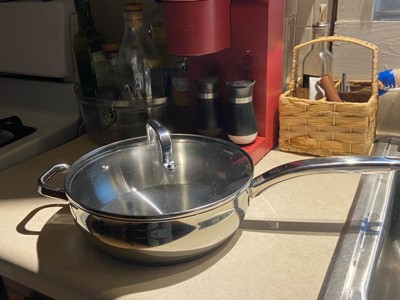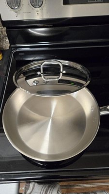 [This review was collected as part of a promotion.] I am obsessed with this new skillet. This skillet is gorgeous stainless steel with measuring markings on the inside of the pan and comes with a lid that fits like a glove. I was surprised at how light the pan actually was. I expected it to be heavier. I was able to cook so many different items in the skillet so far. Everything cooks so evenly, and I'm able to clean it quickly or even put it in the dishwasher without having to worry about peeling. I would definitely recommend this skillet, and I can't wait to add it to my collection.