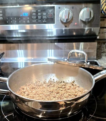 [This review was collected as part of a promotion.] I am obsessed with this new skillet. This skillet is gorgeous stainless steel with measuring markings on the inside of the pan and comes with a lid that fits like a glove. I was surprised at how light the pan actually was. I expected it to be heavier. I was able to cook so many different items in the skillet so far. Everything cooks so evenly, and I'm able to clean it quickly or even put it in the dishwasher without having to worry about peeling. I would definitely recommend this skillet, and I can't wait to add it to my collection.
