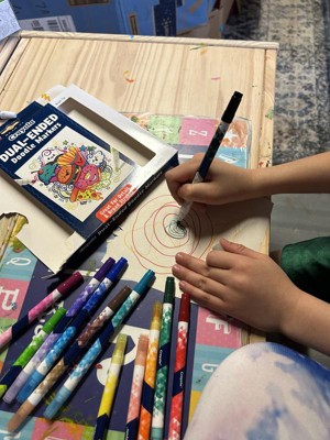 [This review was collected as part of a promotion.] These markers are dual sided with a brush tip and chisel style marker tip. Vibrant colors and the brush tip glides smoothly. If your kid wants the fancy brush tip markers I suggest try these first before committing the extra cash to ones that are less forgiving to rough brush strokes. We enjoyed using these and takes up less space than carrying around both kinds in a backpack