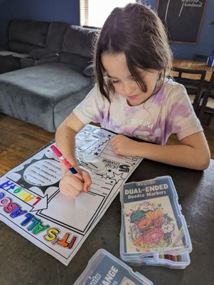 [This review was collected as part of a promotion.] My 9 and 11 year olds enjoyed using these markers to color the Crayola coloring roll. Unlike other markers they’ve used, these dual end markers did not pick up the paper pulp. Additionally, having different shades of the same color, one fine point and the other a chisel point was appreciated by my daughter who enjoyed detailing with a fine market and then coloring in with the broad line chisel point. These were a hit! They also shared that the ink lasted and was vibrant and full.