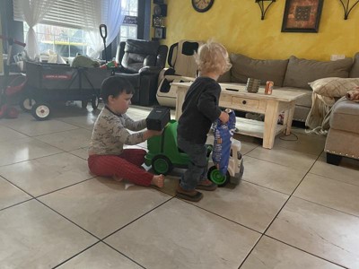 I purchased this for my home daycare and the kids just love it. It’s a favorite among them all. The only complaint I have is that the garage pail comes all the way down and when the kids push off, their feet kick it. I’m afraid they might hit it hard with their feet and break it off. I wish it didn’t come all the way down to the floor. But overall, it’s a great & fun ride on.