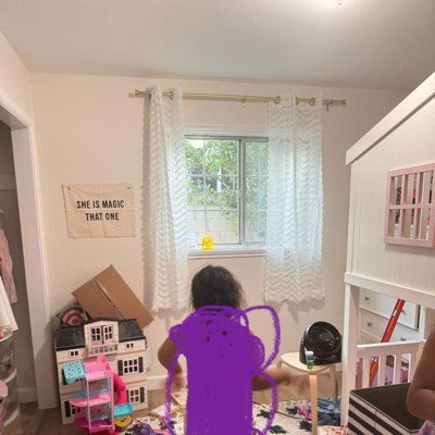 Add dashing style to your child’s room with the Dream Factory Lottie curtain panel pair. This set of two will add light-hearted fun to any space in an instant. The horizontal wave of clipped detail reads as fluttering eyelashes for a whimsical appearance and adds a sense of movement to these drapes. In aqua or blush, this curtain panel set will splash your kid’s room with a soft wash of color. Choose from 63in or 84in for the perfect fit for your child’s window. The matte brushed nickel grommets make installing this curtain panel pair a breeze on a standard curtain rod. Made of 100% polyester to be durable with a lightweight hand feel. To care for this curtain panel set, simply place it in a machine wash as needed. This product was independently tested for harmful substances and certified as free from harsh chemicals by Standard 100 by OEKO-TEX.