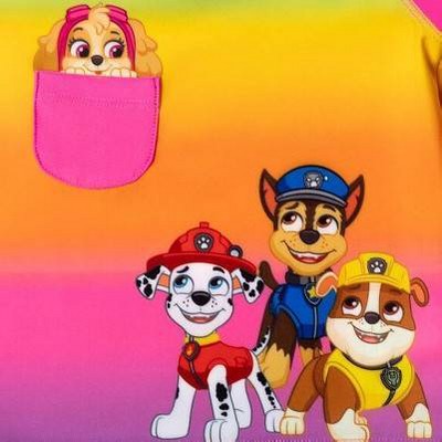 Featuring pups Chase, Marshall, Rubble and Skye with the words "Friends Furever" and a rainbow on tank; Chase, Marshall and Rubble looking up at Skye peaking out of breast pocket on swim shirt; All-over print of rainbows and paw prints on bottoms