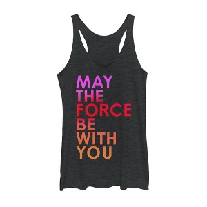 Everyone needs a little more Force in their life like the Star Wars The Last Jedi Force Be With You Heather Black Racerback Tank Top! Ombre style text fades from pink to orange down this soft black Episode VIII tank top that boasts the famous quote "May the Force Be With You".