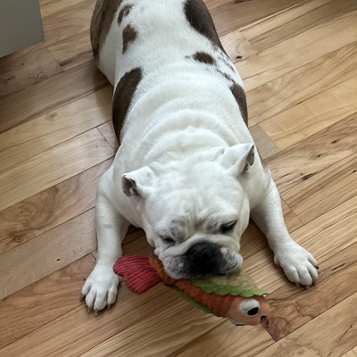 There's something fishy about this taco dog toy. It may be the whip-n-flip tail or the deep grunt squeaker. Or maybe it's just the big smile on Eduardo The Shrimp Taco's face. But he doesn't smell fishy. And that's the important thing.