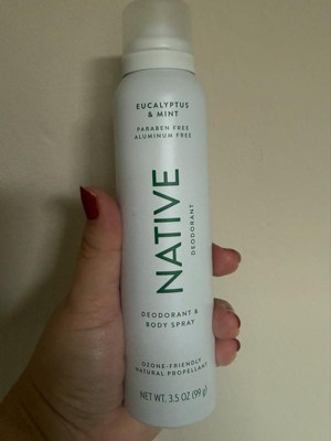 [This review was collected as part of a promotion.] I received the native eucalyptus and mint deodorant spray in exchange for my honest review. I absolutely love it. The scent is perfect and it worked all day long.