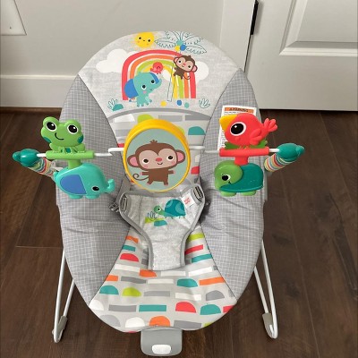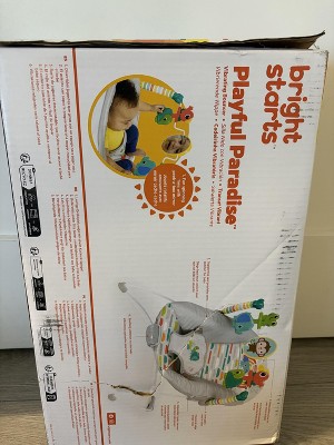 Bright Starts Playful Paradise Vibrating Baby Bouncer with Toys: Detachable Toy Bar, Machine Washable Seat Pad, Calming Vibrations, 3-Point Harness