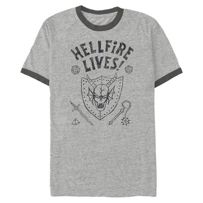 • Shred some metal with this stylish new Stranger Things Men's Baseball Tee that is perfect for Halloween! Featuring the perfect shirt for fans of the Hellfire Club with a design that showcases dice, swords, flames, and demons.