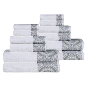 Add style and comfort to your bathroom with the Medallion Cotton Jacquard 12 Piece Assorted Towel Set by Blue Nile Mills. Crafted from durable cotton, these medium weight towels feel soft against your skin and are highly absorbent. Featuring a textured white color with a contrasting medallion border, this towel set combines cozy modern style with a dash of traditional appeal.