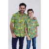 All over print design; Cute and fashionable Hawaiian print design; Button-up front closure for easy dressing; Collared for a fashionable look; Kids and adult sizes for fun matching family outfits; Vibrant Colors