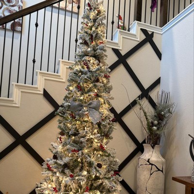 HOMCOM 9 Foot Pencil Snow Flocked Artificial Christmas Tree with Pine Realistic Branches, Pine Cones, Red Berries, Auto Open, Green