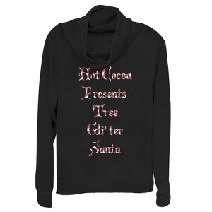 Christmas is right around the corner which means you'll need to gather all the perfect holiday things with the help of your Lost Gods Christmas Candy Cane List Juniors' Cowl Neck Sweatshirt. This Christmas sweatshirt with a draped neckline reads "Hot Cocoa Presents Tree Glitter Santa" in striped red and white text down the front.