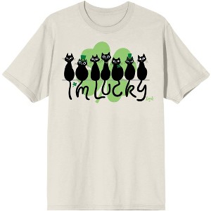 • CUSTOM DESIGN: A group of black cats wear their lucky green clovers, collars, and hats on this graphic tee while their tails spell out, "I'm Lucky." A four-leaf clover fills the background. Skydance Animation's Luck movie fans will love this fun design.