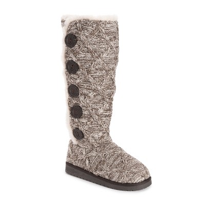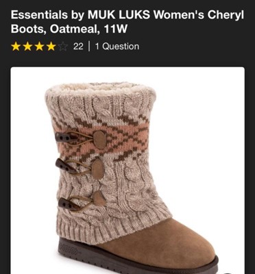 Essentials by MUK LUKS? Women's Cheryl Boots can?t be beat. Cozy sweater knit design and soft faux fur lining blends everyday comfort with on-trend style. Wipe with a damp cloth to clean, no bleach, lay flat to dry. Imported. - Durable TPR Sole - 100% Polyester Insole - 100% Acrylic Knit -Foam Insole -100% Polyester Faux Suede Upper - 100% Polyester Faux Fur Lining - Water Resistant - Multiple color options available - Women?s Whole Sizes 6-11 -Half Sizes Size Up