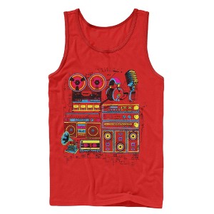Rock to your own beat with the Lost Gods Frequency Red Tank Top. Music equipment is printed with neon highlights on the front of this durable red muscle tee.