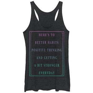 I'm positive that you're positive that you can be positive with the Chin Up Positive Thinking Heather Black Racerback Tank Top! Only positive thinking from here on out with the statement "Here's to Better Habits Positive Thinking and Getting a Bit Stronger Everyday" in an ombre style that fades from purple to turquoise down this black tank top.