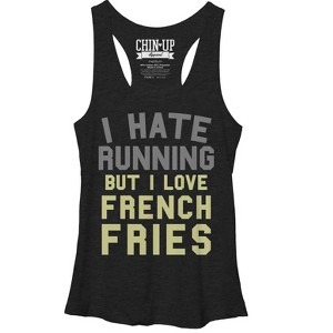 To jog or not to jog? Grab your running shoes and get ready to sweat in the Chin Up I Love French Fries Heather Black Racerback Tank Top. This funny black shirt with soft and breathable fabric reads "I Hate Running But I Love French Fries" to add some humor to your workout wear.