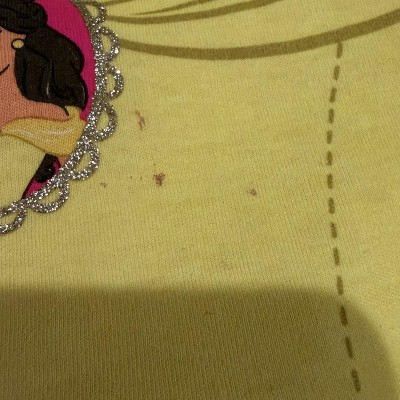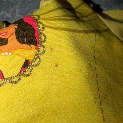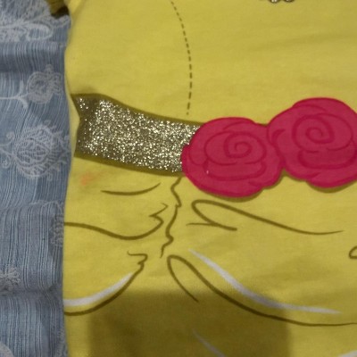 So first red flag was they weren’t even attached with like the plastic tags or nothing I didn’t think much of it but the belle onesie has blood stains and a red stain and one of the flowers has the paint chipped off