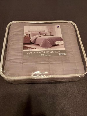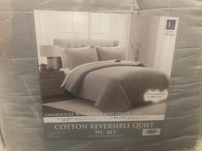 [This review was collected as part of a promotion.] Lush Decor Farmhouse Box Stitch And Stripe Cotton Reversible Quilt 3 Piece Set is a super soft set that looks beautiful! This light gray and white set will look great in any decor. It is solid gray on one side with a box stitch and the other side is white/gray striped. This set has been pre-washed to make it super soft. It is a simple design but has a premium look to it and will look great in any bedroom. It is machine washable and comes out looking like brand new. Included is a full/queen sized quilt and 2 shams and it fits a queen bed perfectly. I would highly recommend the Lush Decor Farmhouse Box Stitch And Stripe Cotton Reversible Quilt Set for any bedroom for a simple but elegant look!