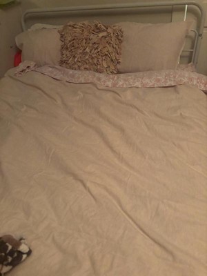 This linen cotton blend is soft and comfortable. It has sewn corner ties to attach the duvet and keep it in place. It has a zipper closure. The cover fits true to size woth a queen duvet insert. The cover did not shrink when washed as instructed. I find that it does wrinkle easily, as you can see in the photos, so you must remove from the dryer immediately. The duvet is simple but could look elegant with thr addition of pillows and blankets. The neutral beige would look great with pretty much any decor.